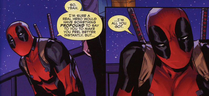 When Deadpool meets a young woman who’s so depressed that she’s contemplating suicide, he doesn’t advocate non-attachment. It’s true that her torments will be temporary, but that’s a Buddhist consolation. Instead, he tells a joke (he justifies his levity by claiming that his powers came when he was “bitten by a sad radioactive clown”) and takes her to experience more pain and suffering.