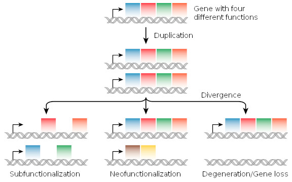 Over many, many generations, this process can make organisms very different from their forebears. When a genome is copied prior to cell division, sometimes the polymerase will slip up and duplicate a stretch of code. These duplication events are incredibly important for evolution – usually, the instructions for proteins can’t drift too far because any change might eliminate essential functions for that cell. If there’s a second copy, though, the duplicate can mutate and eventually gain some new function.