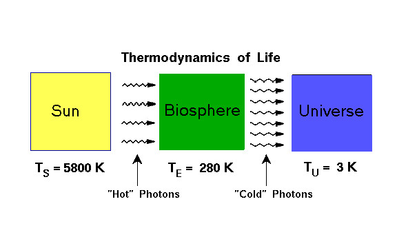When living things use the sun’s energy, we create order – a tree converts disordered air into rigid trunk, a mouse converts a pile of seeds into more mouse, a human might convert mud and straw into a house. As we create order, we give off heat. Warming the air, we radiate infrared photons. That’s what night vision goggles are designed to see. The net effect is that the Earth absorbs high-energy photons that were traveling in a straight beam outward from the sun … and we convert those photons into a larger number of low-energy photons that fly off every which way.