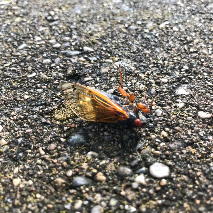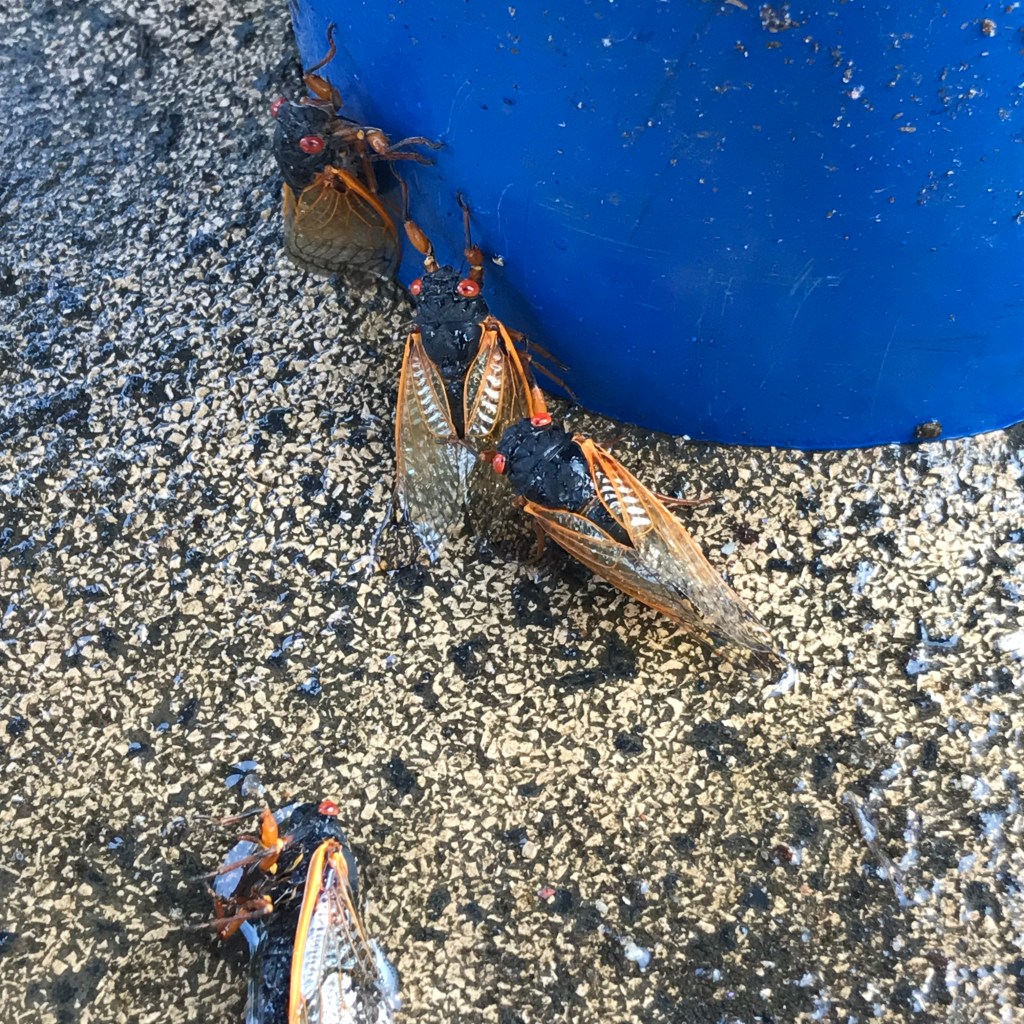 Now that the cicadas’ brief orgy is ending, they will expire. Many have already died: not just the cicadas who were eaten by birds, chipmunks, squirrels, pet cats & dogs, but also the cicadas who simply plummet from the sky, collapsing from the various internal depredations of old age.